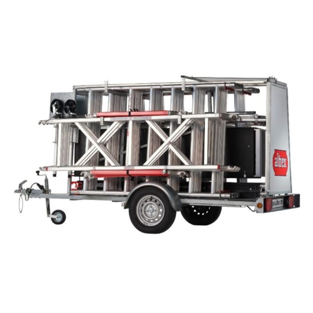 De ALTREX Steigeraanhanger De Luxe zorgt voor veilig vervoer van je steigermateriaal, tot 12.20 m platformhoogte. Of je nu over een brede of smalle rolsteiger beschikt. Met een dubbele borging is je steigermateriaal gemakkelijk vast te zetten. De luxe is de meest complete steiger aanhanger en de achterdeur is in te zetten voor reclamedoeleinden.
